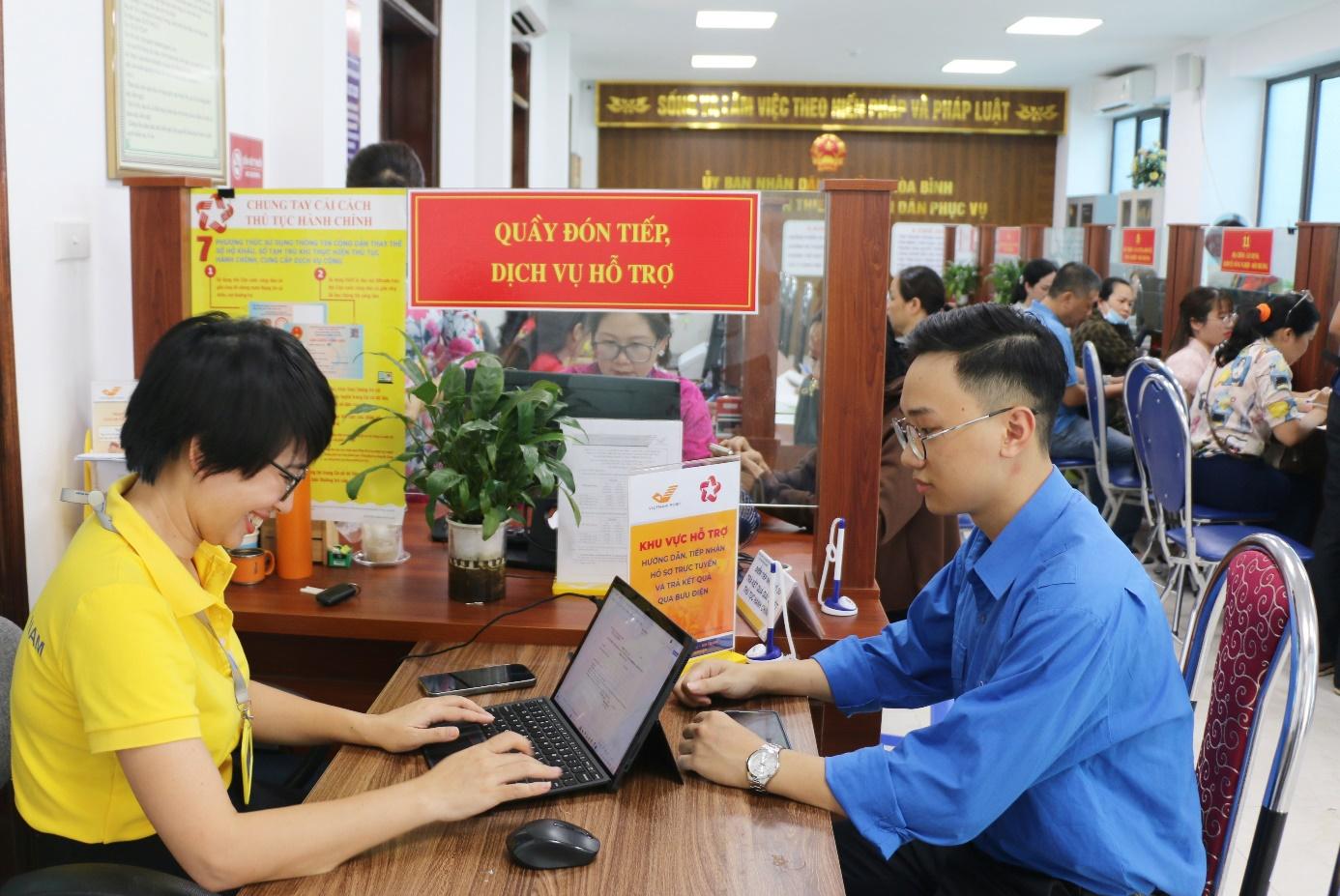 Trung tâm Phục vụ hành chính công phường Hòa Bình bố trí các khu vực hỗ trợ, hướng dẫn, tiếp nhận hồ sơ trực tuyến và trả kết quả qua bưu điện cho người dân