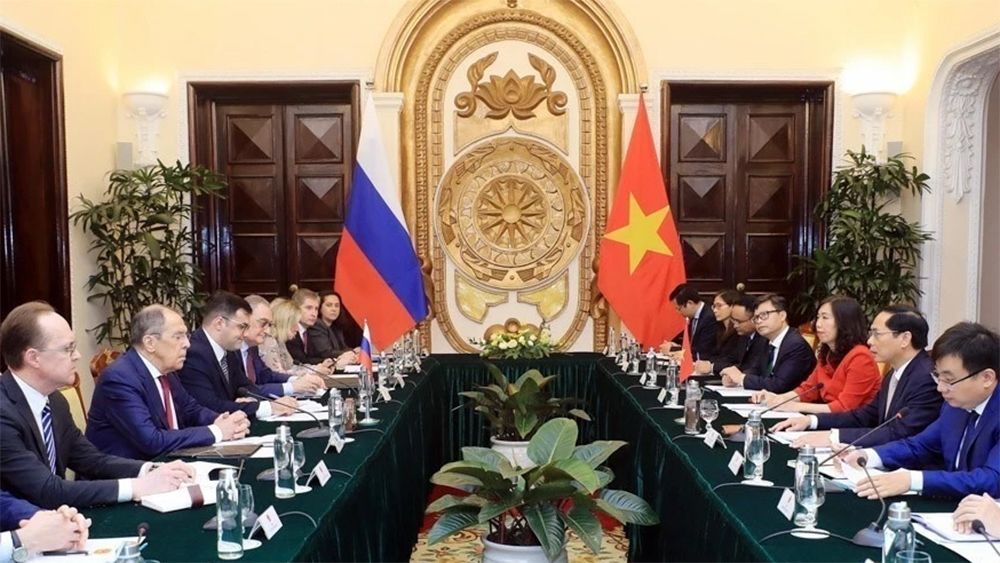 Bộ trưởng Ngoại giao Bùi Thanh Sơn hội đàm với Bộ trưởng Ngoại giao Liên bang Nga Sergey Lavrov sang thăm Việt Nam đúng thời điểm 10 năm thiết lập quan hệ Đối tác chiến lược toàn diện giữa hai nước (năm 2022). (Ảnh: TTXVN)